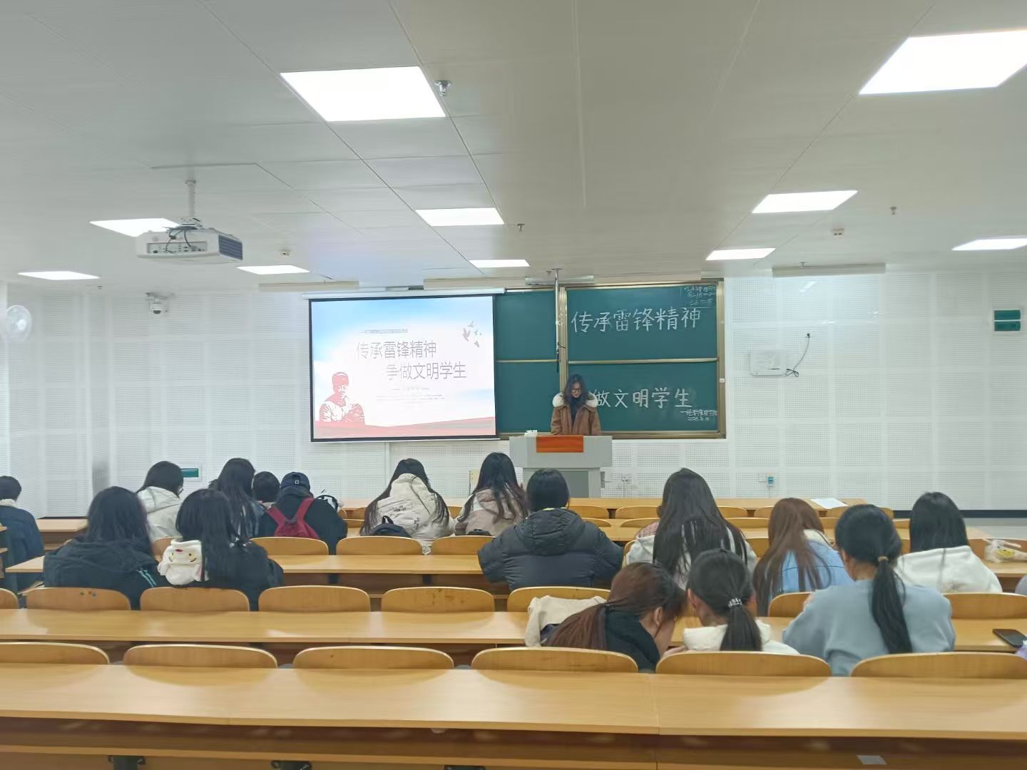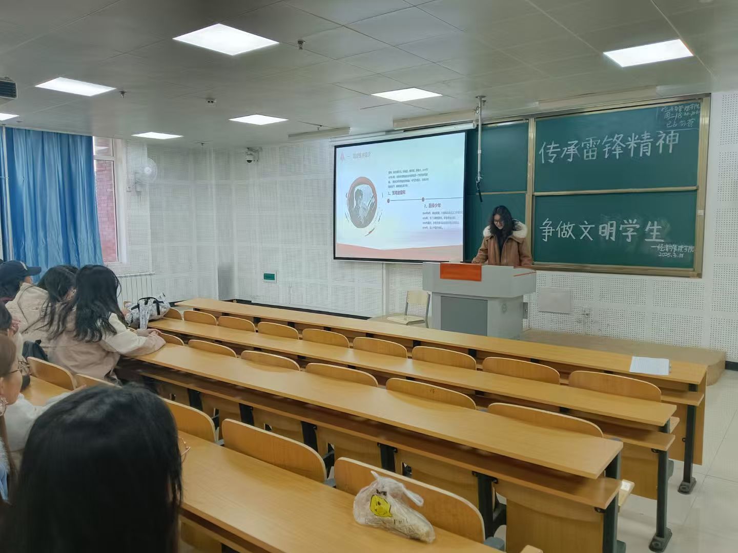 活动伊始,学生代表以讲解PPT的形式,介绍了雷锋同志的光辉事迹和奉献精神,生动再现了雷锋同志"把有限的生命投入到无限为人民服务中去"的光辉历程。同学们专心听讲,对雷锋精神有了深刻的认识。随后,学生代表结合当下,深入浅出地阐述了雷锋精神深刻内涵,并指出在数十年后的今天,雷锋精神早已以新的形式融入生活。从社区服务的"红马甲"到乡村振兴的"青春力量",当代青年正用新的方式续写雷锋日记,使雷锋精神薪火相传,历久弥新。最后,同学们纷纷表示要以青春的热忱传递温暖,用实际行动诠释社会主义核心价值观,在新时代的舞台上书写属于自己的雷锋故事。