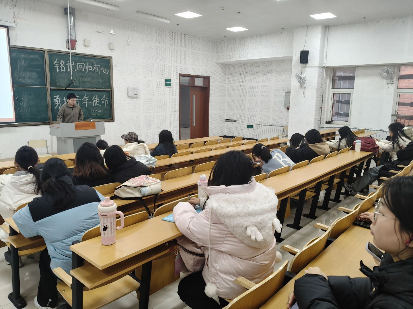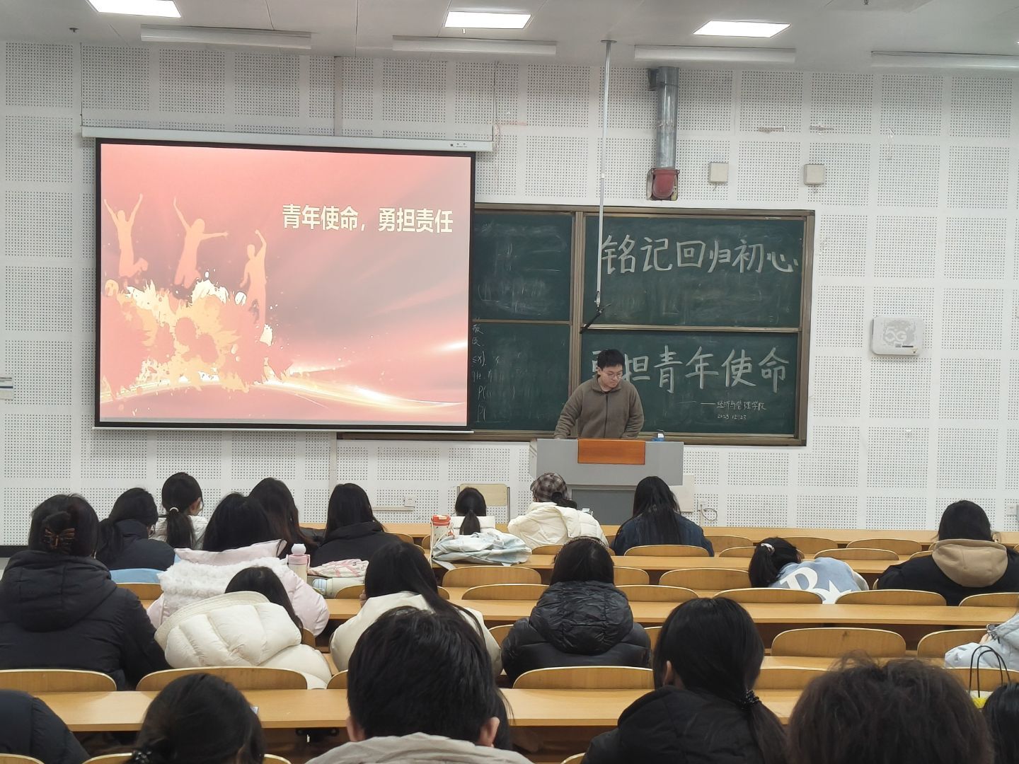 活动伊始,学生代表通过讲解PPT的形式,结合历史文献、老照片与纪录片片段,带领同学们回溯从民族救亡到国家建设、从初心坚守到使命传承的历程,生动讲述了历代青年铭记初心、勇担使命的感人故事,让同学们深刻体会“铭记回归初心”的精神内涵与“勇担青年使命”的时代要求。随后,围绕“新时代青年如何以实际行动铭记初心、担当使命”,同学们展开热烈讨论。最后,大家纷纷表示将立足专业学习,关注社会发展、民生改善等领域,以实际行动践行初心使命,为国家繁荣富强、民族伟大复兴贡献青春力量。